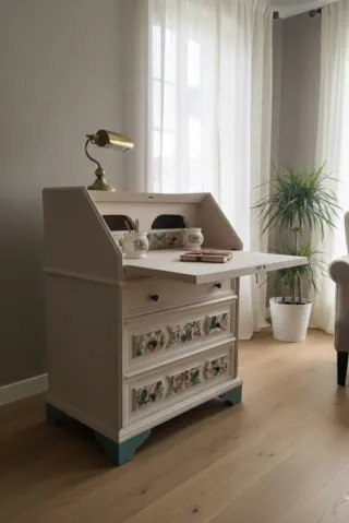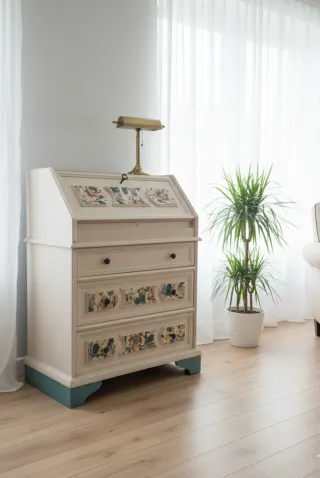 Scrittoio antico restaurato con un tocco moderno. Un pezzo unico che aggiunge carattere a qualsiasi ambiente. - Dettagli floreali con carta decoupage sui cassetti e sul piano. - Base in legno con pittura materica.