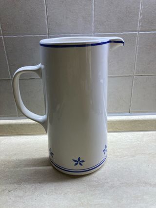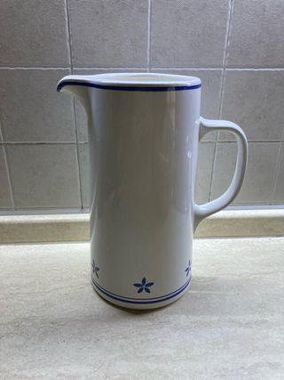 Elegante brocca in ceramica, perfetta per servire bevande con un tocco di stile. - Design in ceramica bianca. - Dettagli decorativi blu. - Bordo superiore rifinito in blu. - Motivo floreale blu alla base.