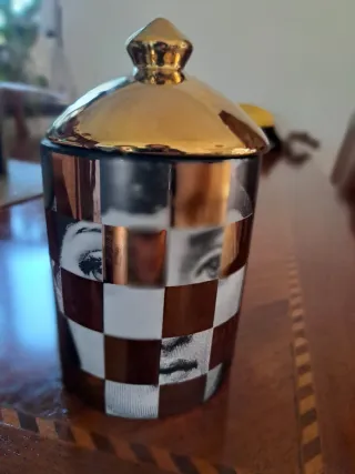 Elegante portacandele con un design unico, perfetto come idea regalo. - Decorazione a scacchiera con dettagli grafici. - Coperchio metallico lucido color oro.