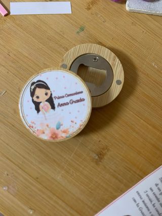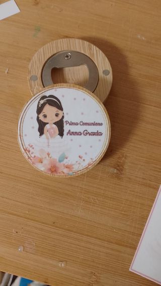 Un ricordo speciale per la Prima Comunione .Magneti e apribottiglie personalizzati. - Decorazione con immagine di bambina e fiori. - Scritta Prima Comunione.. - Dettagli colorati.