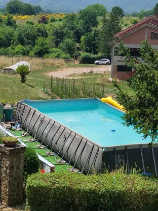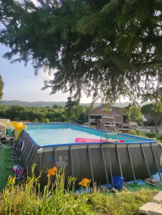 Ampia piscina fuori terra, perfetta per godersi l'estate. - Dimensioni: 10x5 metri. - Struttura robusta in metallo e plastica. Vendita solo piscina più scaletta - Colore interno blu e struttura esterna grigia.