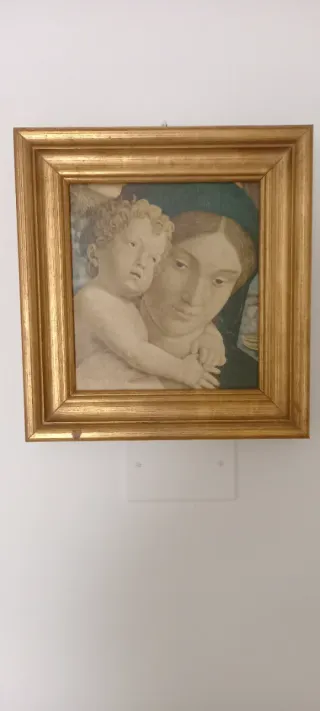 Dipinto su tela raffigurante la Madonna col Bambino di Andrea Mantegna, incorniciato con una cornice dorata anticata. In ottime condizioni a parte un piccolo punto senza doratura come da foto. Dimensioni cornice 26x28. Dimensioni quadro senza cornice 17x19. - Cornice in legno. - Tessuto dipinto.