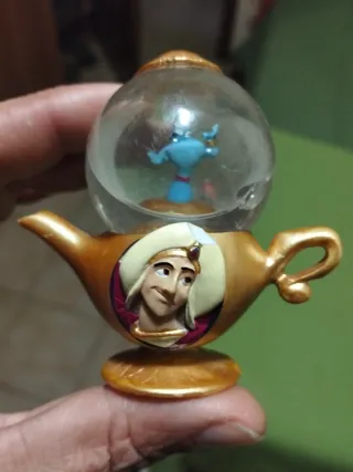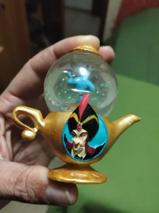Lampada magica ispirata al film Aladino della Disney. Contiene una sfera trasparente con glitter e una figura del Genio. - Design a forma di lampada. - Dettaglio del personaggio di Jafar. - Elementi decorativi scintillanti all'interno della sfera.