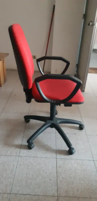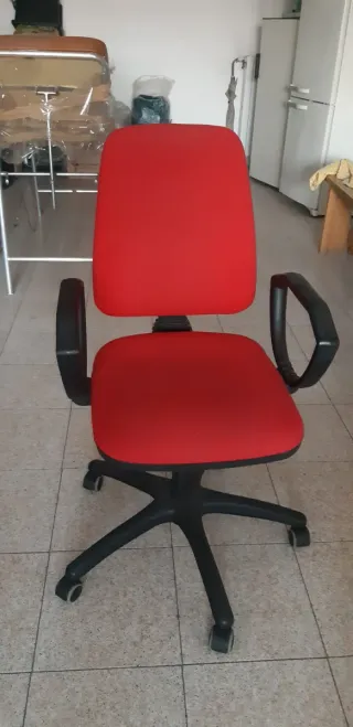 Sedia da ufficio dal design moderno. Seduta e schienale imbottiti in tessuto rosso, struttura in plastica nera con base a 5 ruote. - Imbottitura rossa. - Base a cinque razze con ruote. - Braccioli neri. - Altezza regolabile.
