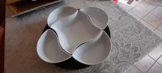 Elegante set di stoviglie in ceramica con base girevole, perfetto per servire. Composto da 5 ciotole sagomate bianche che si possono mettere sia nel micronde che in lavastoviglie e base girevole in legno colore nero. Comodissimo per servire contemporaneamente tutti i commensali potendolo al centro della tavola e facendolo girare su se stesso.