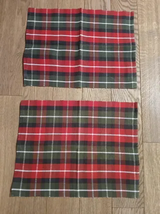 Usati in ottime condizioni. Set per la sala da pranzo che comprende: 2 tovagliette a quadri sui toni del verde scuro e del rosso con dimensioni 48 × 37 cm; 2 tovaglioli tinta unita di colore rosso con dimensioni 37 × 37 cm. Tessuto 100% cotone.