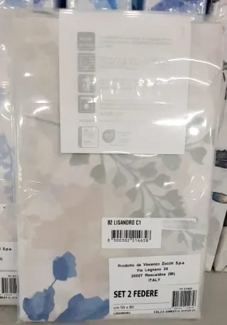 Set di due federe Zucchi 50x80 in percalle di puro cotone, nuove. - Fantasia floreale con fiori blu e rametti verdi. - Made in Italy.