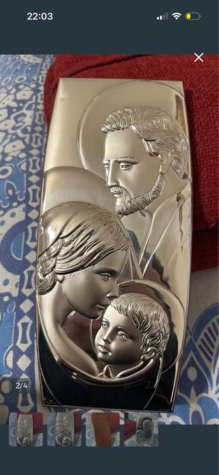 Bellissimo quadro raffigurante la Sacra Famiglia, con un pratico appoggio per essere esposto. - Design elegante e dettagliato. - Realizzato in metallo. Argento .