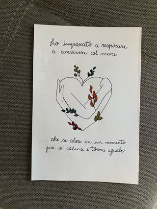 Una stampa con una dolce poesia, frase di Michele Bravi. A5 - ho imparato a respirare a convivere col mare che si alza in un momento poi si calma e torna uguale - Disegno stilizzato di un abbraccio a forma di cuore con rametti e foglie colorate.
