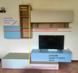 Vendo bellissima parete attrezzata dal design moderno. Il mobile è caratterizzato da un elegante mix di finiture e colori: legno naturale, beige e azzurro. È composto da una base sfalsata con ampi cassetti, vani a giorno e pensili chiusi. Il mobile include già il foro passacavi sulla base per gestire ordinatamente i cavi della TV e dei dispositivi. I pensili superiori sono dotati di pistoni ammortizzati (marca FGV) per un’apertura fluida e sicura. Misure nel dettaglio come da foto. Riferimento TV: nelle foto è mostrata una TV da 42", non inclusa. Ritiro e smontaggio a carico dell'acquirente. Monza, San Fruttuoso (MB)