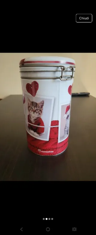Barattolo decorativo in latta con un'immagine di gatti e filato rosso. - Chiusura a scatto con maniglia. - Design a tema felino. Internamente tutto ok, esternamente presenta un po' di ruggine, nessun odore all'interno