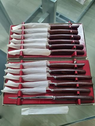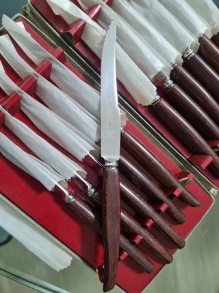 set di 12 coltelli per carne MUTUAL con manico in legno mai usati, in confezione originale