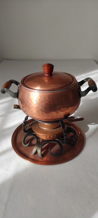 Pentola in rame con fornelletto per bourguignonne o per mantenere in caldo false come la bagna cauda Comprensivo di coperchio fornelletto struttura di metallo che lo tiene in sospensione e divisore per forchettine Articolo degli anni 70 ancora in perfetto stato