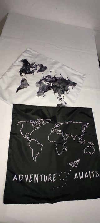 Cuscini mondo: 2 copricuscini 45 * 45 dotati di zip perfettamente funzionante Uno fondo bianco e uno fondo nero.