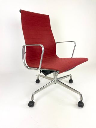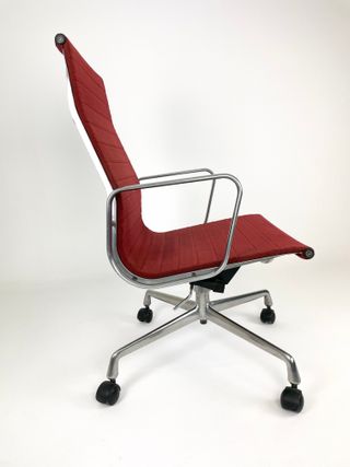 Iconica sedia da ufficio con design moderno. - Struttura in metallo. - Seduta e schienale imbottiti in tessuto rosso.