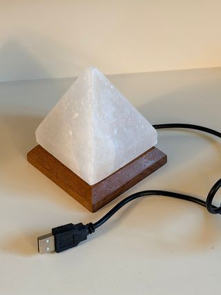 Vendo lampada a forma di piramide con base in legno. Collegandola tramite USB cambia colore continuamente. - Piramide bianca traslucida. - Base in legno. - Alimentazione tramite cavo USB (lunghezza 135cm). Dimensione base 8x8cm. Altezza 11cm. Peso 500g Nota: la lampada si illumina tutta ad eccezione dell'angolo evidenziato nell'ultima foto (probabilmente era stata danneggiata in passato e riparata).