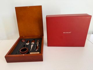 Vendo set sommelier Brandani con scatola in legno. Nuovo. La scatola contiene i seguenti oggetti: - Termometro - Salvagoccia - Tappo - Cavatappi multiuso - Tappo versatore Il set presenta il logo dell'azienda B Braun. Spedisco in scatola esterna originale, la quale però presenta segni di usura. Dimensioni 21,5x18,5x5,5cm Peso 900g