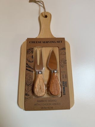 Elegante set per servire il formaggio, composto da un tagliere e due coltelli. - Tagliere in bambù con manico. - Due coltelli in metallo con manici in legno. - Dimensioni tagliere: 28.5x14cm. #taglieri #formaggio #tagliere #coltello #set #granapadano #parmigianoreggiano