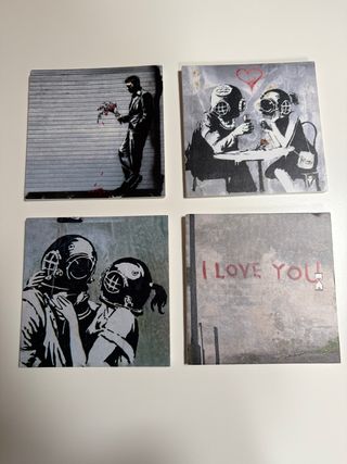 Set di mini quadretti artistici stile Banksy, serie “Late Lovers Pack” di Graff.io. Si tratta di un set composto da quattro stampe decorative in edizione limitata (500 copie), realizzate in Inghilterra, complete di Certificato di Autenticità rilasciato da Graff.io, numerato e firmato. Le opere sono ispirate a celebri soggetti di Banksy e sono ideali come complemento d’arredo moderno per casa o ufficio. I quadri sono nuovi ed in perfette condizioni ✅ Possibile ritiro a mano o spedizione.