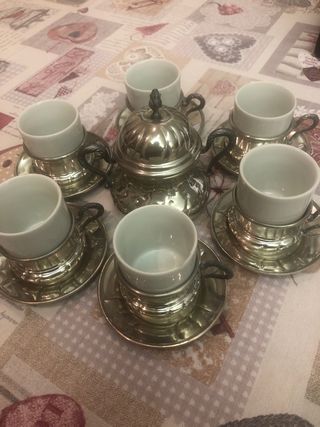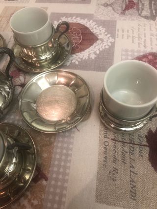 Composto da 6 piattini, 6 sotto tazzine, zuccheriera il tutto il peltro 95% le tazzine sono 5 (1 è rotta)