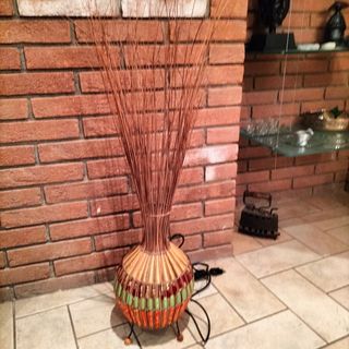 Lampada abatjour stile arabo. Gli steli che emergono dalla base sono in erba naturale essiccata avvolti da tessuti colorati (in questo caso, arancione, bordeaux e verde). Poggia su quattro gambe metalliche nere, ciascuna con un piccolo piedino in legno. Altezza cm 91. Buonissime condizioni.