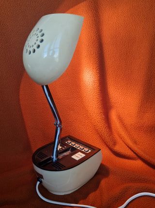 Lampada da tavolo vintage Timco, modello EX 60, risalente agli anni '60. Un pezzo di design unico che unisce illuminazione e un tocco retrò. oggetto molto raro. È un classico del design Space Age degli anni '60/'70, di colore crema chiaro . Un orologio digitale con sveglia e funzione sveglia è integrato nella lampada! La lampada è estensibile. La luminosità può essere regolata su due livelli. L'altezza della lampada può essere variata a piacere. Il paralume ed il braccio di sostegno sono pieghevoli.Graffi sul display - Design iconico. - Struttura in metallo e plastica. - Colore beige e argento.