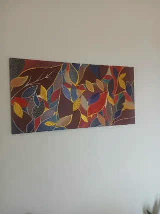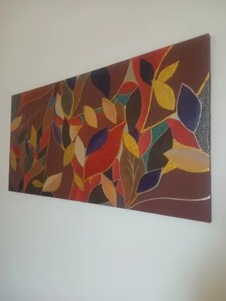 Dipinto astratto con un motivo di foglie. Stile originale. - Colori vivaci e dettagli dorati. - Stile moderno e decorativo. Misure 120cm x 60cm. Pronto da appendere non necessita di cornice.