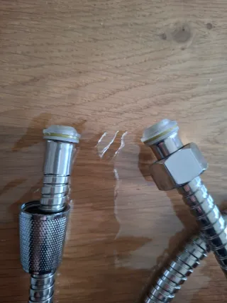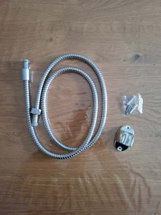 Serpentina doccia in acciaio inox. Doppio attacco al rubinetto e allo spruzzino. Lunghezza: 1,5 metri. Incluso supporto per spruzzino da attaccare al muro con due viti fornite. Lo spruzzino non è incluso.