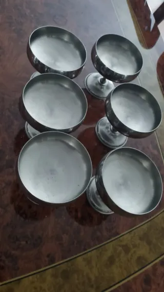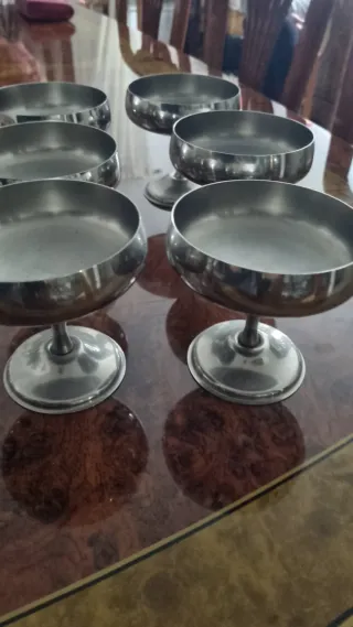 Elegante set di sei coppe da gelato in acciaio inossidabile. Perfette per servire dessert con stile. - Design classico e intramontabile. - Materiale durevole e facile da pulire. - Ideali per gelati, macedonie e altre prelibatezze.