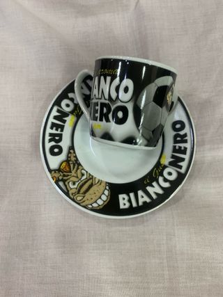 Set da caffè con tazzina e piattino a tema Bianconeri. - Design con scritta Bianco Nero e grafica. - Ideale per gli appassionati.
