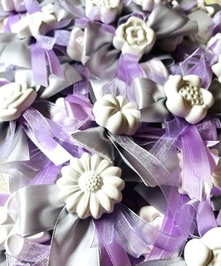segnaposto fiori 3x3cm in gesso profumato nastro lilla e grigio 50 pezzi (solo Gessetti con fiocco)