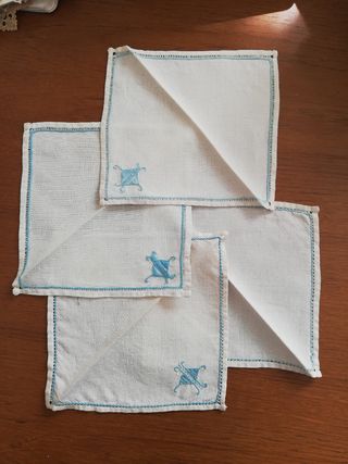 Sono 4 tovaglioli, presumibilmente anni '70. Ricamati a mano. Misurano 16 x 16cm. Li vendo così come sono, da lavare per togliere eventuali segni del tempo. Sono a disposizione per ulteriori foto e info.