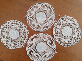 Sono 4 sottobicchieri lavorati a mano. Diametro 12cm circa. Presumibilmente anni '50. Sono a disposizione per ulteriori foto e informazioni.