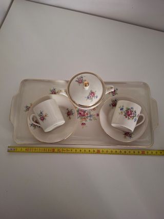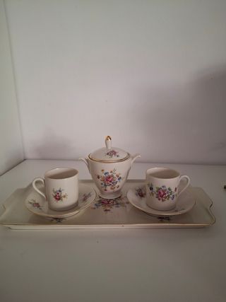 Servizio da caffè caffè per 2, tête-à-tête, in fine porcellana con disegni floreali e bordi dorati. Sono 6 pezzi: 2 tazzine, 2 piattini, 1 zuccheriera ed 1 vassoio circa cm 30x 15,50. Acquistato negli anni '50 in un negozio di Torino di cui conserva ancora l'etichetta. Sono a disposizione per ulteriori foto e info.