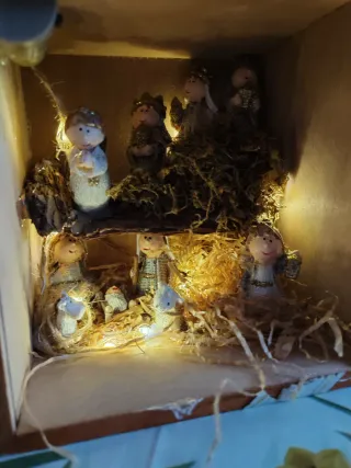Un suggestivo paesaggio con presepe realizzato in resina, arricchito da luci che creano un'atmosfera magica. - Elementi decorativi in sughero. - Figure del presepe in plastica.