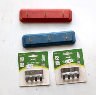 Lotto composto da 2 confezioni contenenti 4 appendini in acciaio con buco se non si vuole utilizzare l’adesivo si mette la vite nel buco predisposto misura cm 1,5x 3,5 h. e 2 appendini in legno ( 1 rosso e 1 blu) con adesivo da 3 posti , misure: cm 18x 4,5 h