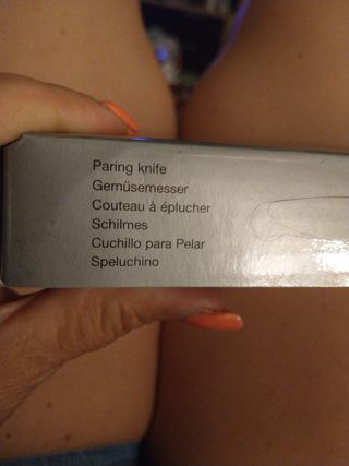 Coltello da cucina Tupperware con manico ergonomico. Usato poco in ottime condizioni - Lama in acciaio inossidabile. - Custodia protettiva viola inclusa.