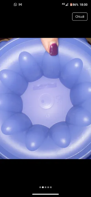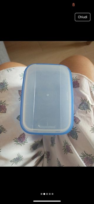 Ciotola in plastica di colore azzurro. - Design con anelli concentrici sul coperchio. - la ciotola e perfetta l'unica cosa è che il coperchio non si chiude si può appoggiare sopra o usare come insalatiera o cibi freddi