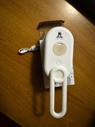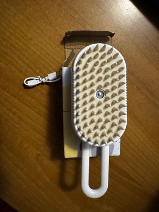 Spazzola elettrica a vapore per animali domestici. - Design bianco e compatto. - Include cavo di ricarica USB. - Logo PET PEP sul fronte.