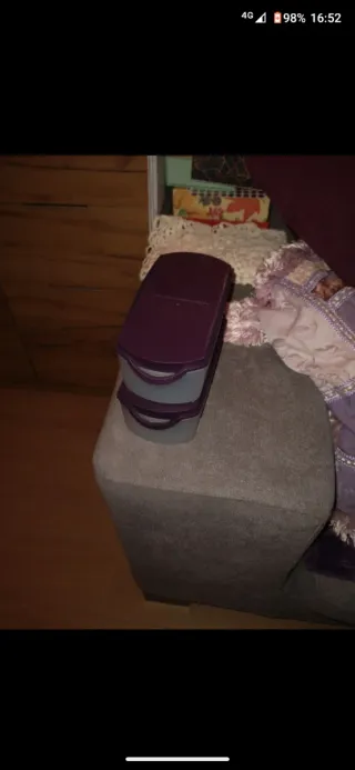 Set di due contenitori Tupperware. Capacità 350ml - Colore trasparente e viola. - Realizzati in plastica.