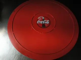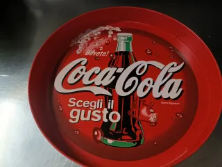 Vassoio rotondo con il classico logo Coca-Cola e una bottiglia. - Design vintage. - Colore rosso vivace con dettagli bianchi e verdi. - Realizzato in metallo.