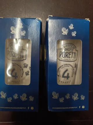 Set di due bicchieri da birra Angelo Poretti. - Design con logo Angelo Poretti. - Decorazioni a tema luppolo.