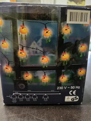Set di luci decorative a tema Halloween, perfette per creare un'atmosfera spettrale. - Design a forma di zucca con cappello da pirata e benda sull'occhio. - Dettagli verdi pendenti che ricordano delle gambe. - Adatte per uso interno o esterno.