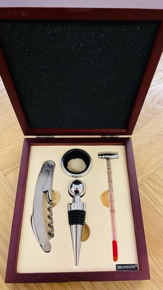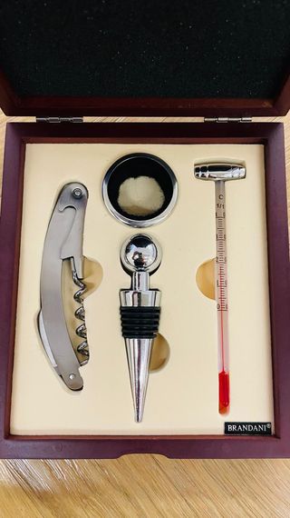 Elegante set da sommelier Brandani, perfetto per gli amanti del vino. Include diversi strumenti essenziali per l'apertura e la conservazione delle bottiglie. - Cavatappi, anello salvagoccia, termometro e tappo ermetico. - Accessori realizzati in acciaio inossidabile. Nuovo, mai usato.