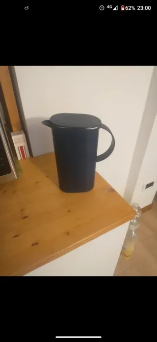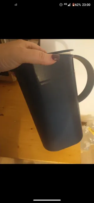 Caraffa Tupperware di colore blu scuro, perfetta per servire le tue bevande preferite. - Design elegante e funzionale. - Manico comodo per una presa sicura. - Coperchio per mantenere fresche le bevande.