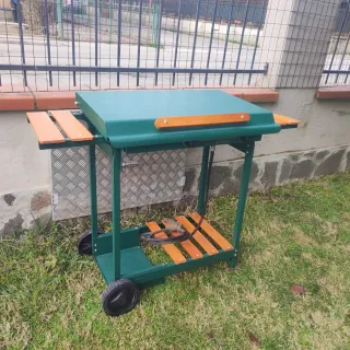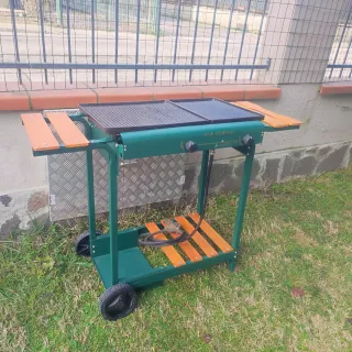 Barbecue a gas OMPAGRILL con due griglie in ghisa. - Struttura in metallo verniciato verde. - Piani laterali in legno. Vendo per acquisto BBQ in muratura