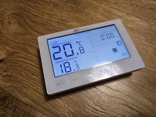 Cronotermostato settimanale per il controllo della temperatura a display con molteplici configurazioni - Funzione LUN per il giorno della settimana. - Indicazione della temperatura rilevata. - Indicazione della temperatura impostata. - Funzione TEMPO e MANUALE.