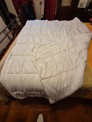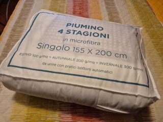Piumino 4 stagioni in microfibra, ideale per tutte le stagioni. È composto da due piumoni unibili tramite bottoni automatici. - Piumone estivo: 100 g/mq - Piumone autunnale: 200 g/mq - Piumone invernale (unione dei due): 300 g/mq - Misure: 155 x 200 cm