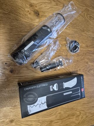 Elegante cavatappi elettrico Brandani, perfetto per aprire le tue bottiglie di vino con facilità. Cavatappi a batteria (4 x 1,5AA) con Taglia Capsula, Versatore, Tappo sottovuoto, Set Regalo. MAI USATO ancora con la pellicola e/o sacco di protezione. - Design moderno e funzionale. - Finitura nera lucida con dettagli trasparenti.