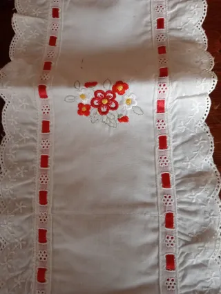 Bellissima runner ricamata a mano. . - Motivo tenero con ochetta e paesino. - Ricamo curato nei dettagli. Misure : 31x55 - cotone Nuovo, mai usato Spedito con Bartolini o InPost o PT
